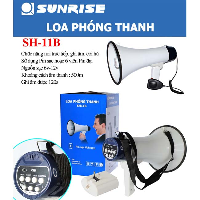 Loa phóng thanh Sunrise SH-11B sử dụng cho các mục đích ngoài trời như bán hàng, hướng dẫn viên du lịch, tổ chức sự kiện ...