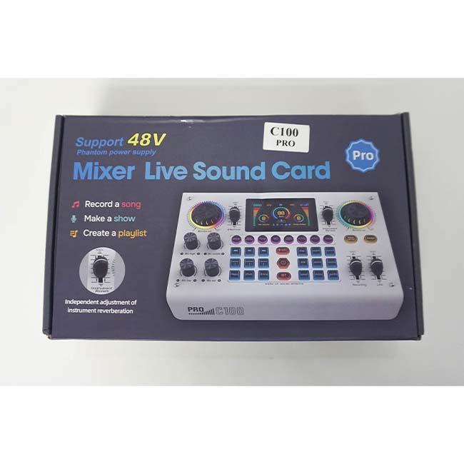 Soundcard livestream C100 Pro là soundcard livestream, soundcard có 15 hiệu ứng và có hỗ trơ nguồn 48V cho micro condenser. Soundcard có kết nối bluetooth để lấy nhạc và livestream 2 điện thoại cùng lúc.