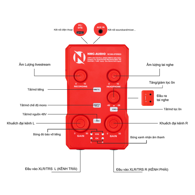 - NMC-AUDIO đã tích hợp công nghệ chống nhiễu ANC (Active Noise Cancellation) trên SC380-STEREO, giúp xử lý tạp âm nhanh chóng chỉ với một nút bấm duy nhất – Ngoài ra, thiết bị còn trang bị vòng xoay tinh chỉnh từ -66dB đến -36dB, cho phép bạn chủ động điều chỉnh mức lọc nhiễu phù hợp với từng môi trường sử dụng