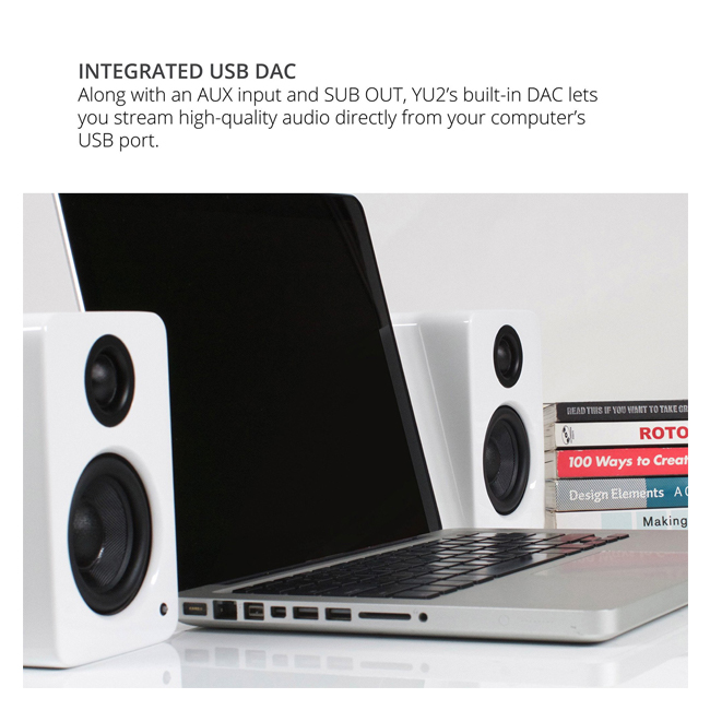 Là một yếu tố thiết kế độc đáo, YU2 mang đến cá tính và chất lượng cho máy tính để bàn của bạn. Card âm thanh tích hợp cho phép bạn truyền phát âm thanh chất lượng cao trực tiếp từ cổng USB của máy tính, mang đến âm thanh thách thức quan niệm rằng càng lớn càng tốt.