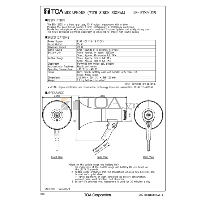 Loa phóng thanh cầm tay TOA ER1215S là một thiết bị di động công suất 15W với còi báo động tích hợp, được sử dụng phổ biến trong các hoạt động ngoài trời như hướng dẫn du lịch, sự kiện, hoặc dùng để thông báo ở nơi công cộng. Loa có thiết kế gọn nhẹ, sử dụng 6 pin R14P(C) cho thời gian hoạt động lên đến 14 giờ, phạm vi nghe rõ khoảng 250m và có chức năng còi hú để tạo sự chú ý khẩn cấp.