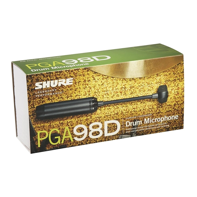 Micro trống condenser búp hướng Cardioid Shure PGA98D tái tạo rõ ràng âm thanh trống và bộ gõ. Sản phẩm bao gồm giá treo mic, túi đựng. Mic có thiết kế cổ ngỗng linh hoạt và bộ tiền khuếch đại tích hợp cho nguồn phantom và kết nối XLR.
